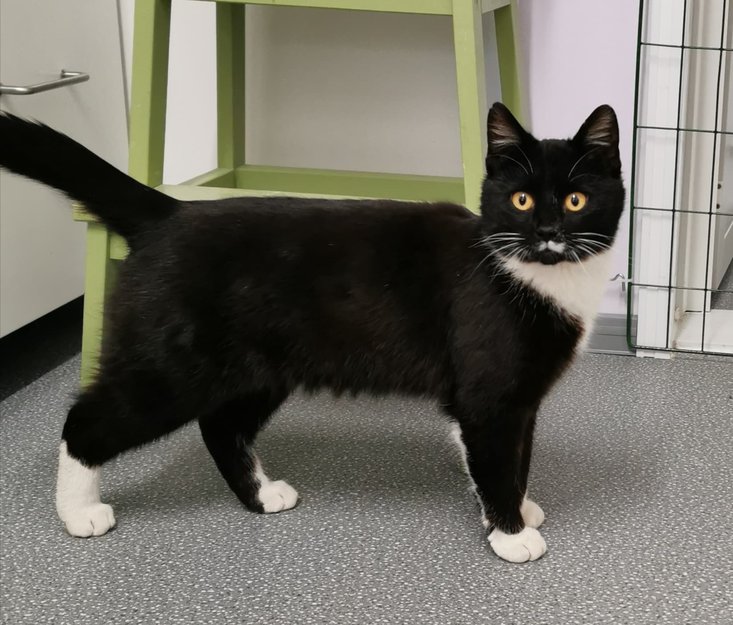 Ung katt, estimert under to år. Hvit asymetrisk "bart", tre hvite sokker og mye sort på venstre bakben. Kaninmyk pels. Øremidd og masse flått. Ukastrert og ikke idmerket. Tillitsfull og kosete.
