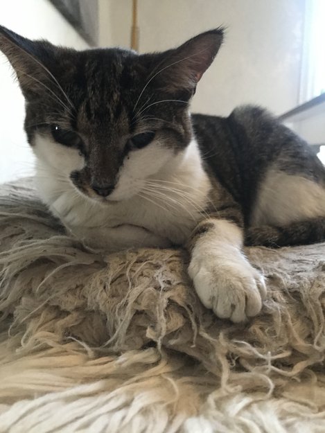 Minki er en 1 årig sterilisert hunnkatt. Hun er veldig liten for alderen og kan se ut som en stor kattunge. Hun er spraglete grå med mye hvitt i ansikt og under magen. I panna har hun en M og når du ser henne fra siden ser man antydning til svarte prikker i pelsen.