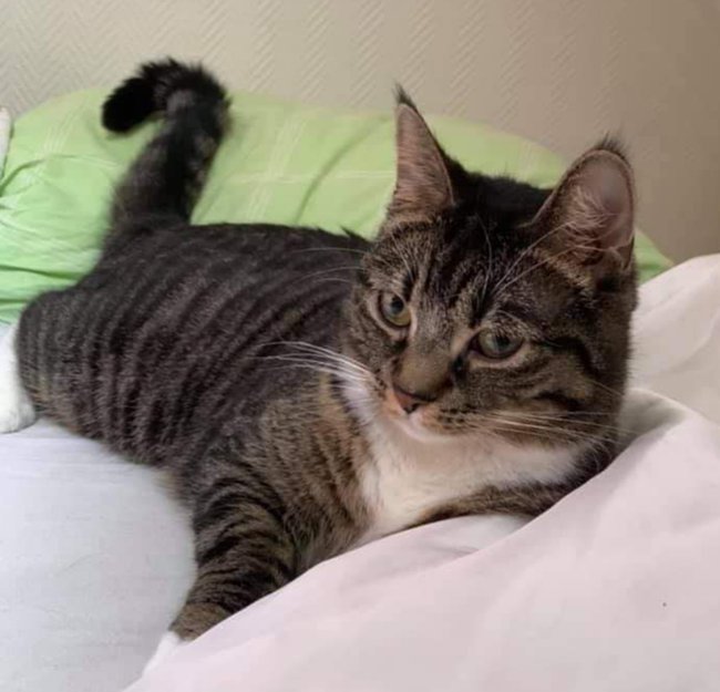 Tigerstripet hunnkatt. Har hvite poter og hvitt bryst. Har øretatovering ID. Er chipoet.