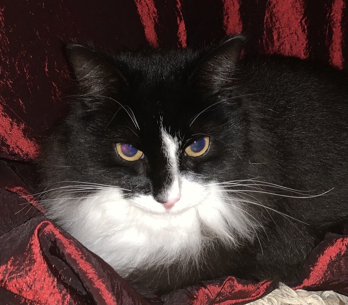 Langhåret mørk, men i sola skinner pelsen i brunt. Hvit bles litt skjevt plassert over neseryggen. Hvit under haken. Hvite sokker på alle poter, de bakre lenger enn de fremre. Hvit pels under magen. Hun er veldig verbal og «snakker» mye, i allefall her hjemme. Litt sedat/rolig type, som trives best i øverste etasje i kattetårnet sitt med utsikt til verden utenfor.