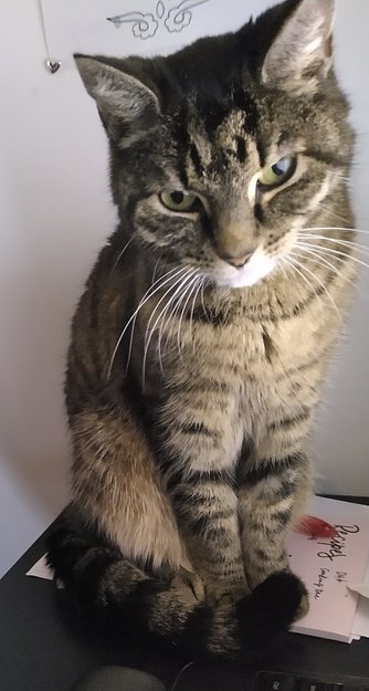 Malin er 14 år, liten katt, straks under 3 kg. Hun er brunstripete med lysebrun mage. Hun har hatt problem med fôrallergi i det siste, med kløe i ørene og har pga det hatt mindre sår på ørene og litt pelsbortfall på ørespissene.