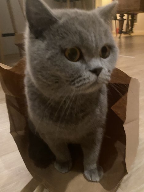 Han er en grå, snill katt, så liker å kose seg med mennesker. Det et innekatt.