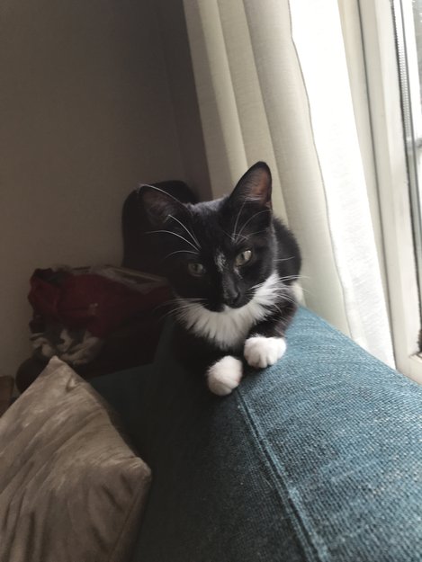 Hun er svart og hvit på brystet, med hvite poter . Litt langt hvit oppover på bakbeina . Også hvit på magen.