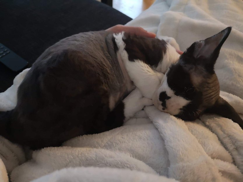 Svart med hvite sokker og krage. Er brukt som terapikatt. Utpreget nærhetsøkende.