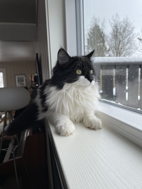 Sort og hvit, liten katt, ca 11 mnd gammel.