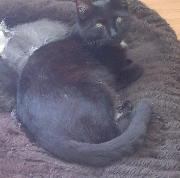 Veldig søt ansikt. Svart med hvit bryst/hals, hvit flekk på mage. Rød halsbånd med bjelle. Mille er 2 år.