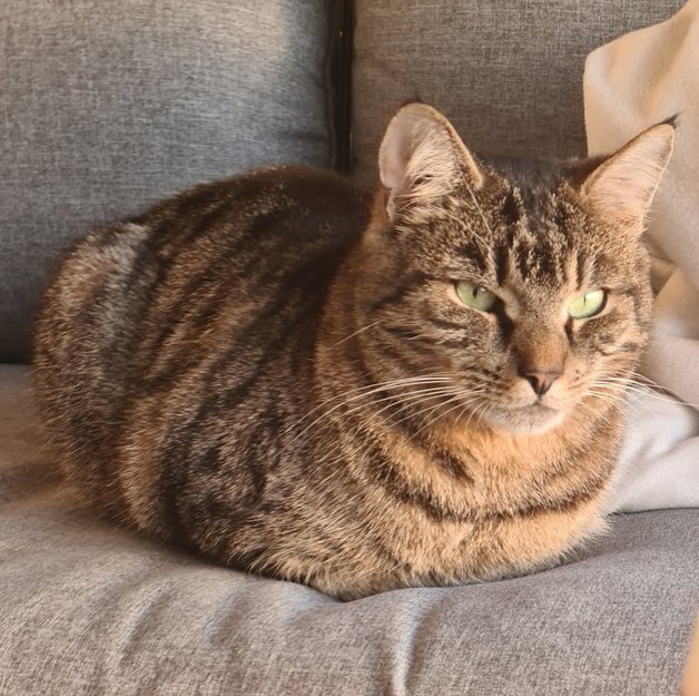Tabby-katt. Ca 5,2 kg. Kort lys/mørk-stripete pels.