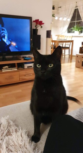 Hun hadde på seg et rosa halsbånd med en bjelle på. Hun er helt svart bortsett fra noen få hvite hår på brystet og litt hvit mellom bakbena.