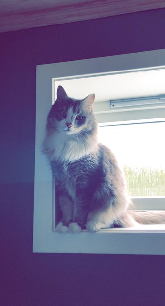 Kastrert hannkatt. Chippet. Langhåret. I hovedsak grå med hvitt bryst og hvite poter. Noe lyse brunt/beige innimellom. Svært sosial pus. Kan være litt lydredd. Nyskjerrig som katter flest, redd han lett kan bli innestengt i garasjer ol.