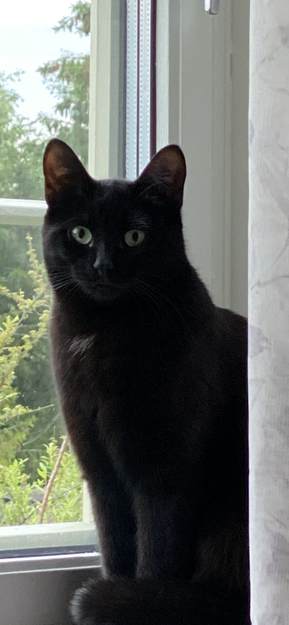 Liten sort med litt hvitt på brystet. 2 år gammel. Sky for fremmede mennesker. Id og chip