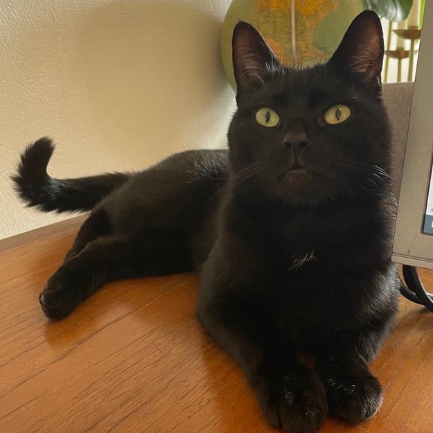 Voksen, tre år gammel, bitteliten og slank hunnkatt på ca 3-3,5 kg. Har en hvit flekk på nakke/mellom skulderblad som ser ut som maling etter en tidligere skade som liten. Noen få hvite hår på brystet, og et par hvite stikkelhår på hvert øre. Veldig nysgjerrig og kvikk, men kan være sky mot fremmede.