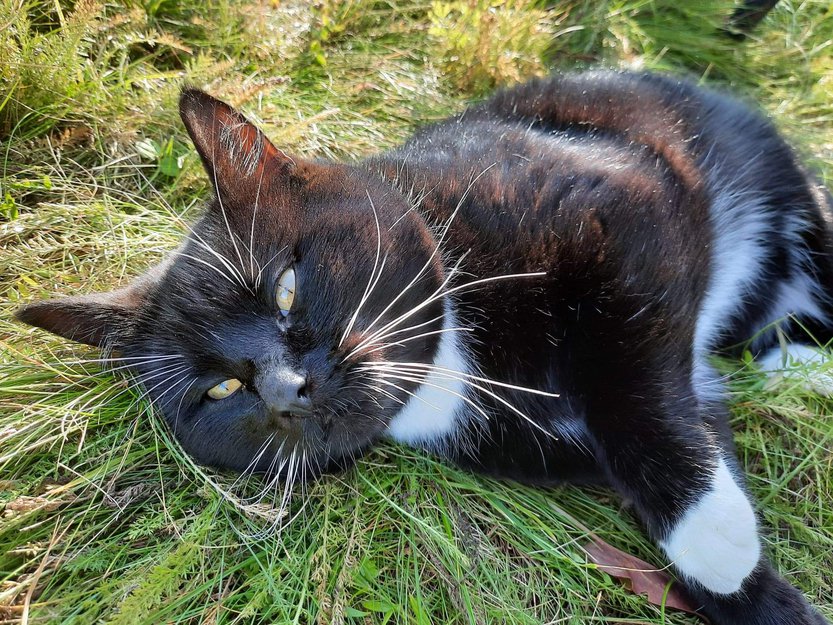 Han er svart og hvit i farge. Veldig kosete. Han var vorte før, ble funne i nabolaget.