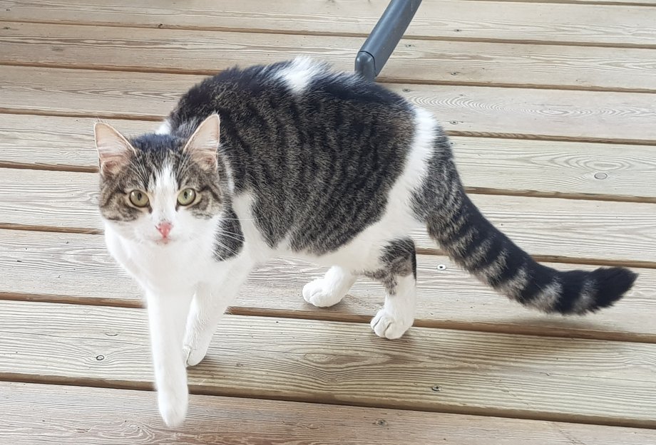Hunnkatt. Tigersripet hale i sort og grått. Ellers spraglet/stripet, med en hvit flekk på ryggen. Lysebrun på ørene. Veldig tynn, men ekstremt pratsom og kjælen.