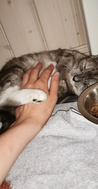 Hun har gule øyne, hvit og grå stripete pels, små kattunge som er 7 måneder
