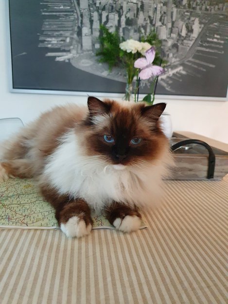 Blå øyne, kjennetegn: har mørk flekk bak på venstre bakben.