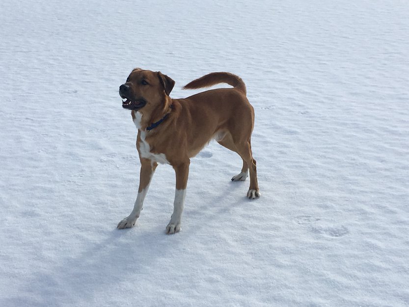 Brun med hvite poter og hvitt bryst. Leken og sprek