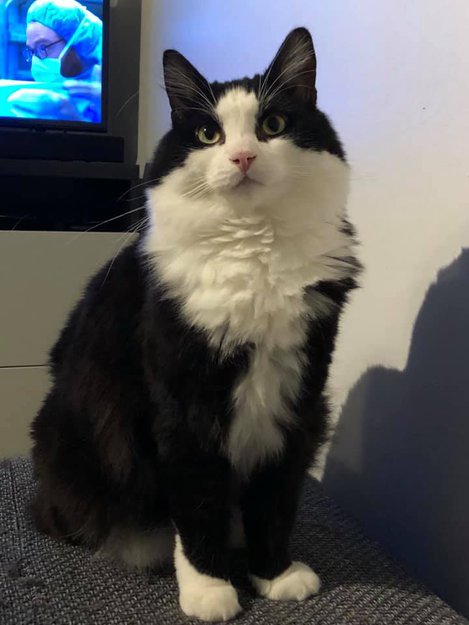 Langhåret, svart og hvit katt med ekstra mye pels rundt brystkassen. Han har en hvit prikk på rumpa, og det går en svart strek gjennom det hvite på magen hans.