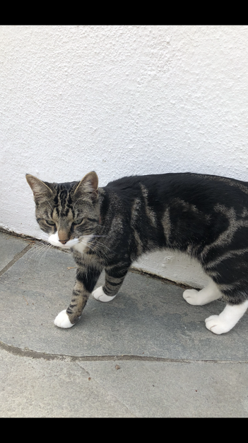 Ung hannkatt ( 1,5 år) Stor, men slank. Hvite sokker og hvite tegninger i ansiktet. Sosial; glad i barn og hunder. Følger gjerne etter folk med hund.