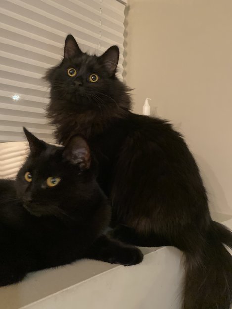 Hun er sort, gule øyne. Liten katt. Veldig kosete, snakker mye. Hingst langt hår men noe innslag av brunt rundt hals og på hale