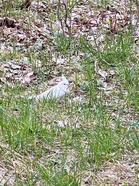Hvit mellomliten fugl. Muligens litt gule fjær på toppen av hodet.