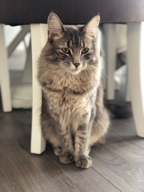 Veldig lydig på navnet Camaro, han er barbert på magen fra sitt siste veterinær besøk i tillegg til en liten del av fremste ben er også barbert. Veldig kosete, mellom langt hår.