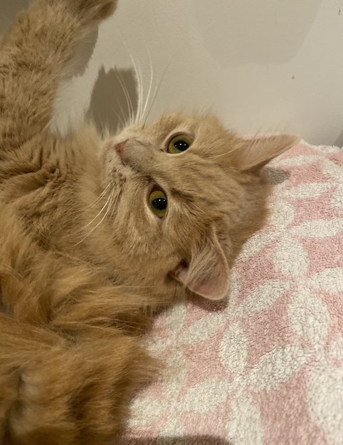 Mildt tigerstripet/spraglete. Gyllen/beige/krem i fargen. Lys kant innerst ved øynene. Fyller snart et år, så liten i størrelsen. Vakker. Chippet.