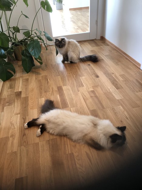 Lys pels med gråmasket ansikt ,mørk hale og blå øyne