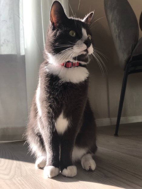 «Panda» ansikt, hvite poter, hvit under magen. Mest grå. Uten halsbånd.