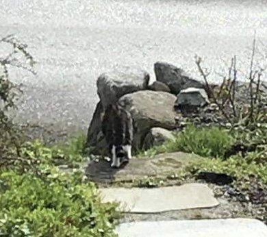 Flerfarget katt - sett i ca 4-5 dager. Tynn og søker kontakt, men stikker når vi vil hjelpe/gi mat