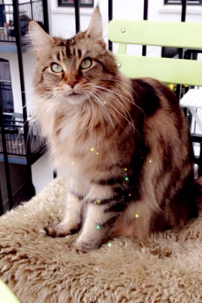 Hun er redd høye lyder. En lang frøken med en tjukk lang mørk hale. Hun er 6/7 kilo. Litt blanding av multicolor og tigerstriper. Svart pels oppå ørene sine.