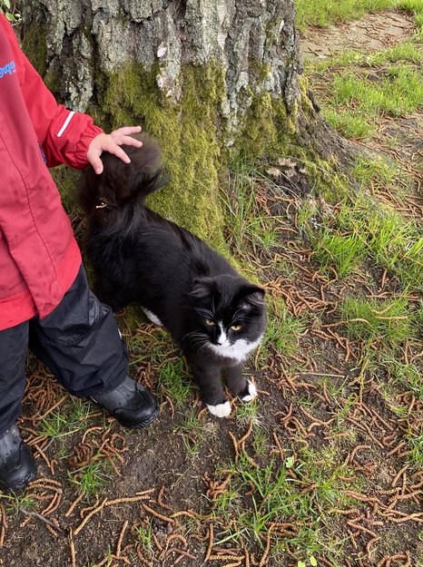Veldig søt og kontaktsøkende katt på besøk.. Mulig den bor i nærheten, men aldri sett den før. Kom i dag tidlig og kom tilbake i ettermiddag. Var veldig interessert i å bli med inn og sulten (mulig vi bare har veldig god kattemat)
