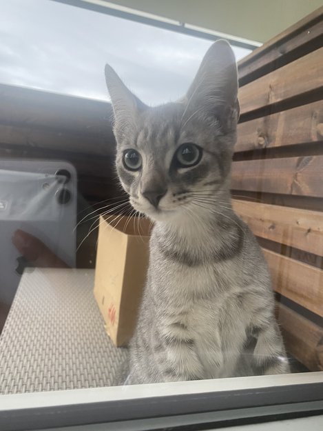 Ung katt, antakelig rundt 1 år. Slank, lite hode og store ører