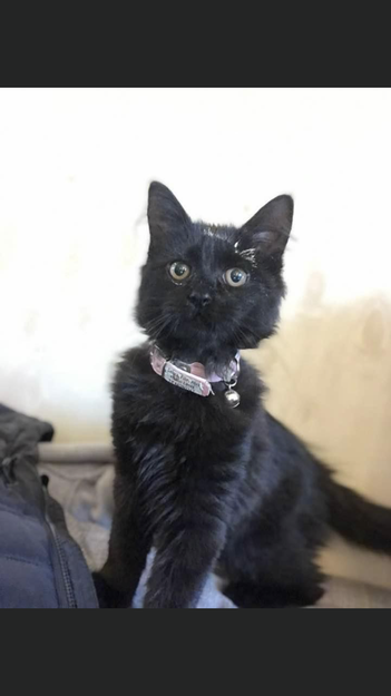 Liten hunnkatt med rosa halsbånd med bjelle. Er chippet men har ikke id nummeret her.