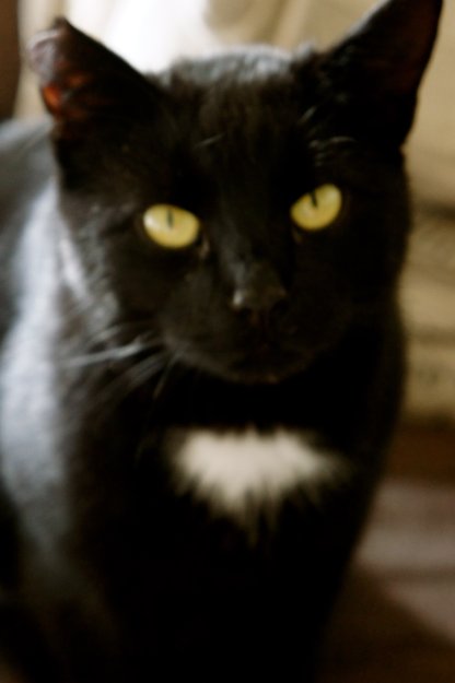 hvit flekk på brystet og litt hvit ved øret. mangler litt av øreflippen på høyre øre.