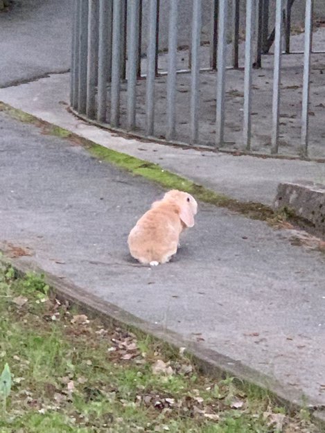 Hengende ører, hvit hale, tilsynelatende ren pels, relativt liten.