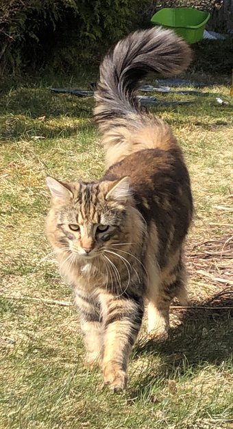 Ung, stor Norsk skogskatt som er spesielt varm i fargene. Peisen er tabby mønstret. Kastrert og id merket og generelt skeptisk til mennesker han ikke kjenner. Snill, rolig type som liker andre katter og er nysgjerrig av seg.