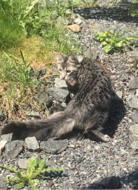 han har askepels med svarte striper, en luftig hale og ligner på rasen Maine coon. Håret vokser fra ørene hans