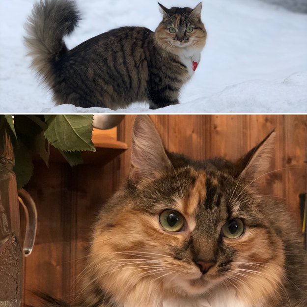 Trefarget katt men mest brun/grå. Flere farger i ansiktet. Hvite poter og hvit på brystet. Hun har et barbert område på høyre side og har et arr under på magen etter en operasjon for noen uker siden.