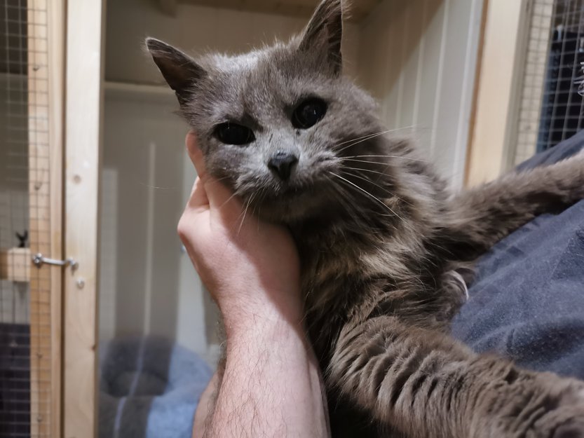 Katten er liten, og har lang grå pels, som har tovet seg voldsomt. Vi har barbert vekk noe av det som er plagsomt til pusen. Pusen har en liten hvit flekk på brystet under haken. Veldig kosen. Har ikke chip. Katten er trolig en godt voksen katt på 13 år. Hun er blind, noe som kan forklare avmagring om hun har gått lenge ute.