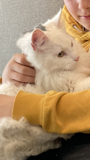 Hvit langhåret med grå flekk på hodet. Han er 1 år, kraftig beinbygning. Har en svak mjauing, ikke lett å høre.
