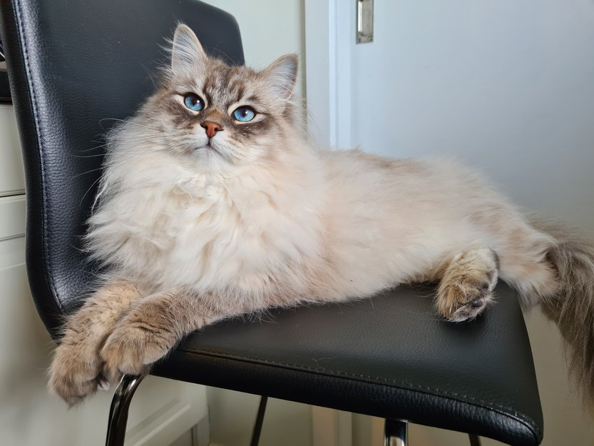 Mørk på ryggen, halen og potene og spraglet i fjeset. Ellers lys i pelsen. Vanligvis snill og nysgjerrig, men er en innepus og har vært redd for å være ute i det åpne før.