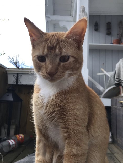 Orange pels som er litt spettet på ryggen, en litt mørkere stripe langs rygg og hale. Benene er stripete og en M i panna. Hvit under haken og på magen. Fire orange striper på langs på magen. Alle potene er hvite. Er veldig glad i å ligge på fanget å få kos.