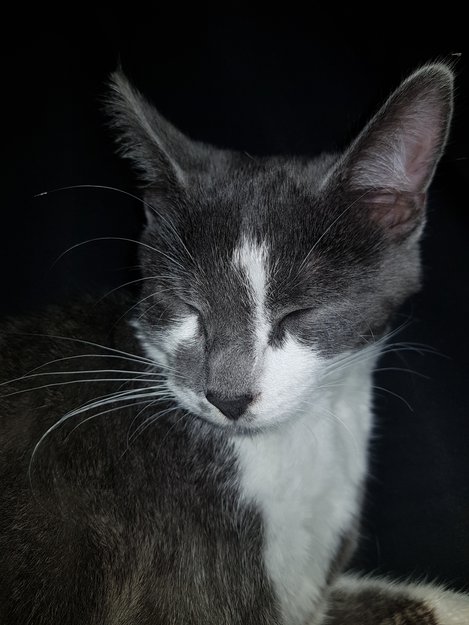 Usymetriske tegninger i ansiktet, to små grå flekker under nesa. Grå på rygg og hale, mye hvitt på magen, hvite potet, grå og hvite ben.