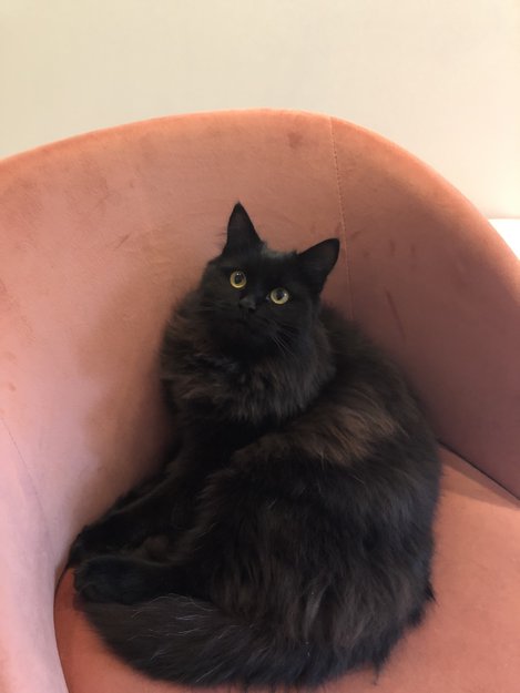 Hun er 1 år gammel, liten, sort og langhåret. Hun har en hvit flekk nederst på magen.
