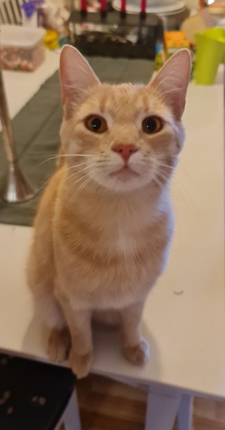 2 år gammel, er en kastrert og chippet hankatt, lys beige I pelsen, og har på ett blått halsbånd.