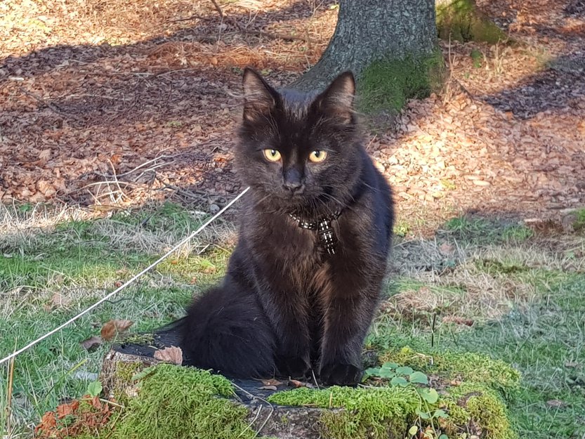 Han er svart som natten og halen er stor pga lang pels. Har noen hvite hårstrå mellom bakbeina og på brystet. Han har rødt halsbånd med bjelle på. Han er litt brun på undersiden og bak beina. Han hadde blitt 2 år i sommer, hvis det har noe å si.