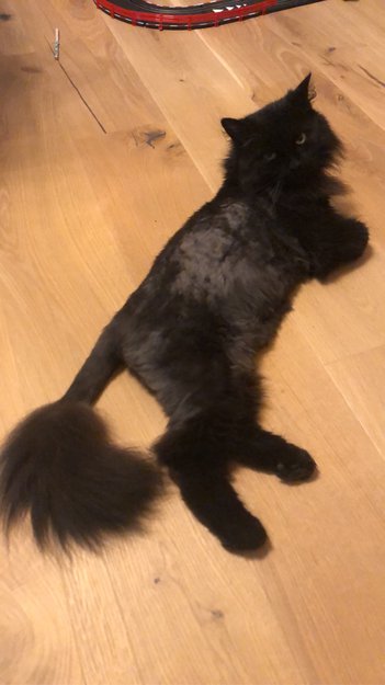 Svart kastrert hannkatt med løveklipp. Langhåret der den fremdeles har pels.