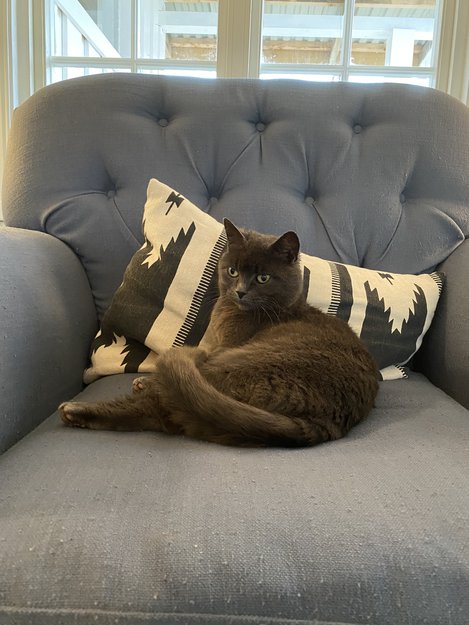 Grå, korthåret katt med antydning til striper på halen. Har ikke ID-tatovering i øret, men har ID-chip. Veldig tett pels. Hun har en liten "pose" under magen etter kastrering. Pratsom katt.
