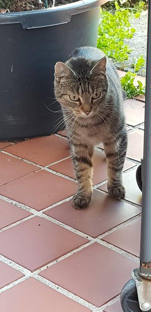 Spraglete ung katt har holdt seg i område i 2-3 uker. Sulten og på let etter mat. La ut ei kokt potet som den slukte. Ser litt pjusk ut på bakparten og tror det kan være en hu katt.