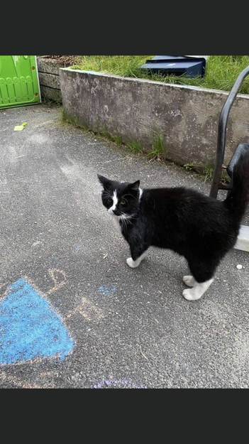 Svart og hvit hannkatt, kort pels. Veldig kosete, slever en del pga mangler tenner. Ikke tynn.